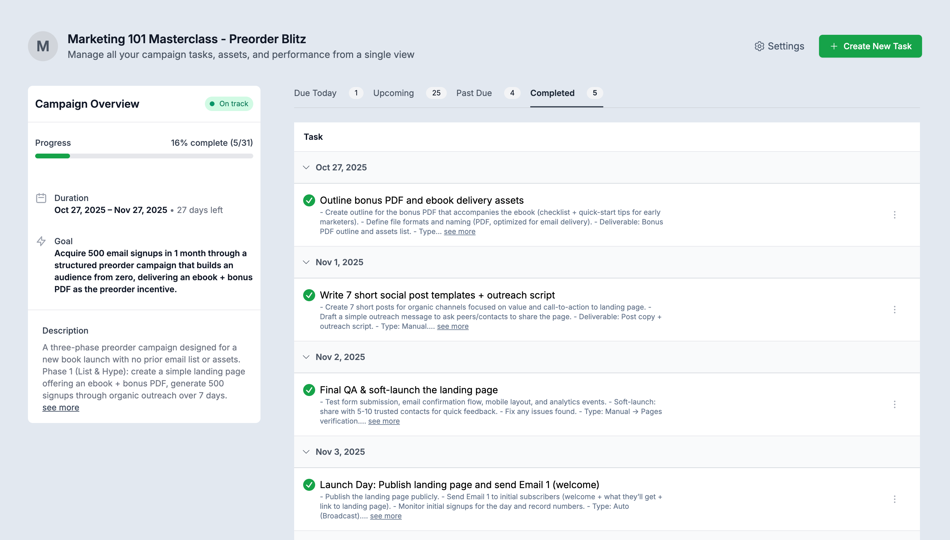 Organize tasks, monitor progress, and analyze performance across all your campaign assets. Everything you need to launch campaigns that hit your goals and drive measurable growth.